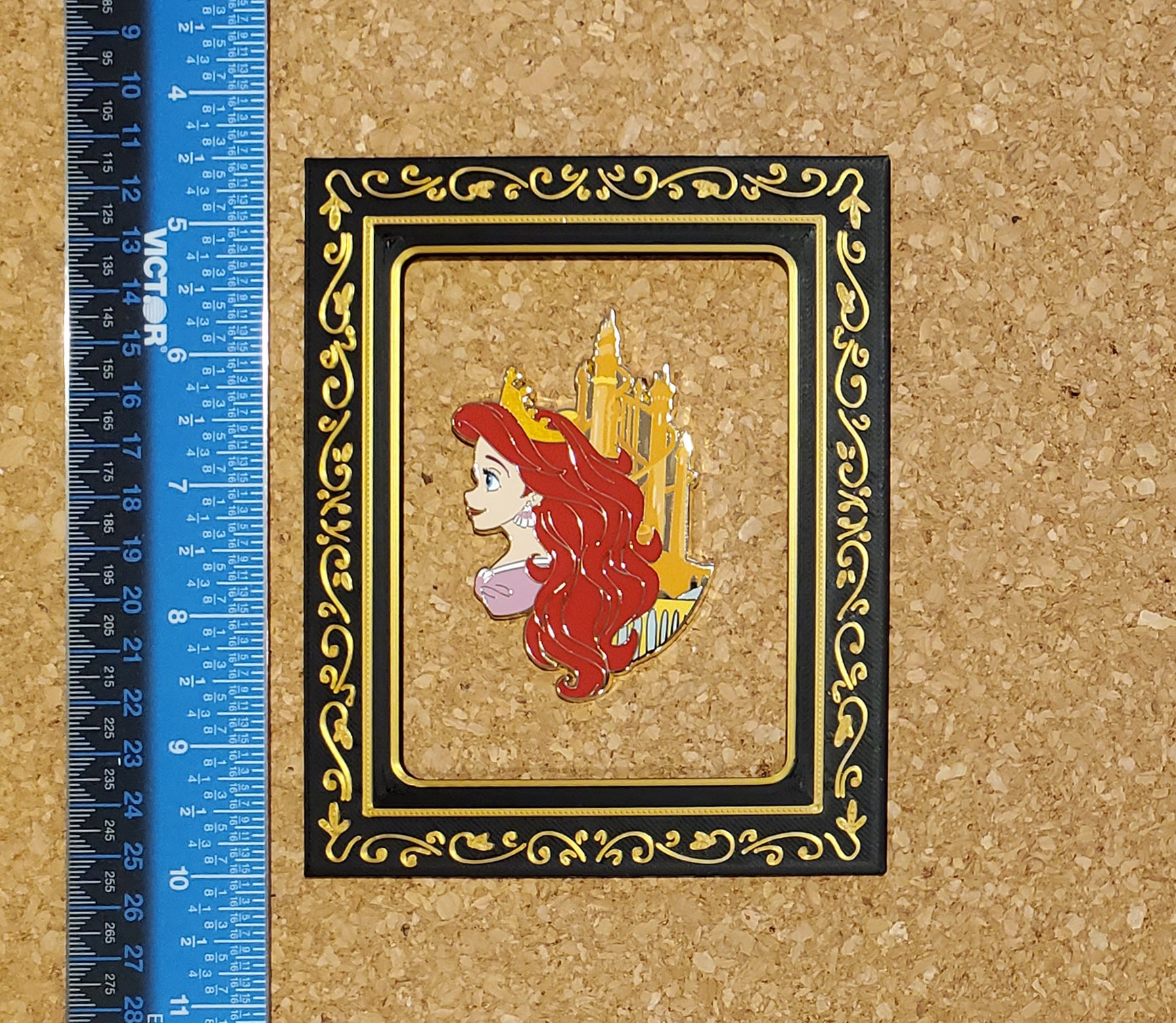 Elevate your collection with this striking portrait frame. The intricate scrollwork and bold contrast bring a sense of luxury and refinement, turning your pin into the focal point of an enchanted display. Perfect for princess pins, castles, or any centerpiece piece, this frame transforms your collection into a fairytale-worthy gallery while complementing other frames in the Enchanted Portrait series.